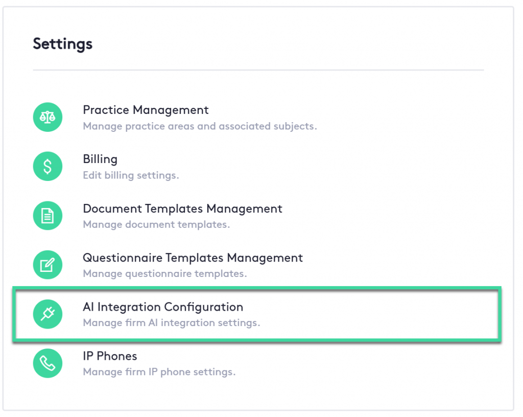 This guide explains how to access the AI Firm Integrations Configuration panel, how to add and manage integrations at the firm level, and how to assign them to selected users or groups.