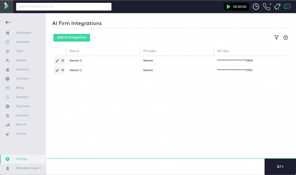 The Firm-Level AI Integrations settings in Maatdesk allow administrators to centrally manage AI provider configurations for the entire firm. Unlike individual AI Integrations—which each user configures independently—firm-level integrations can be assigned to all users, specific users, or user groups. This enables standardized, controlled, and scalable AI access across your organization.