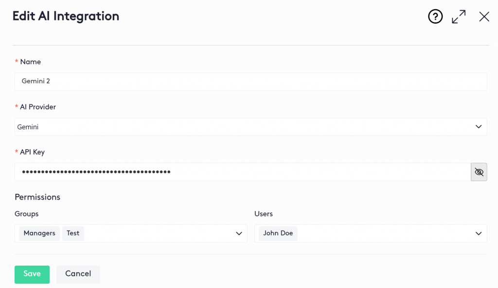 Once saved, the integration becomes available for assignment to users and groups. They can now use them in the AI Tools section.