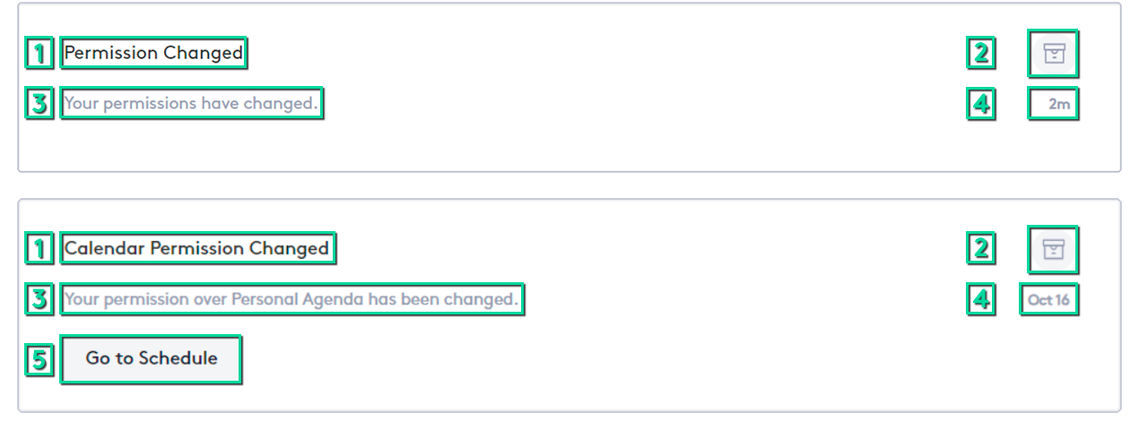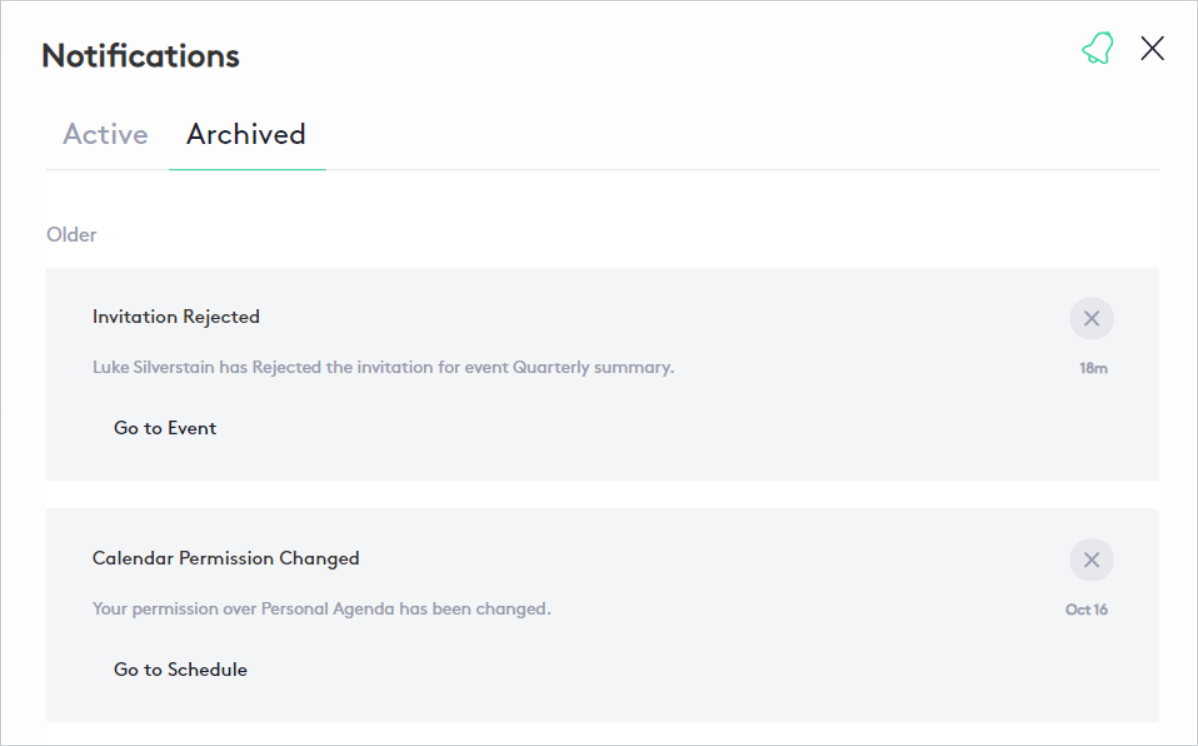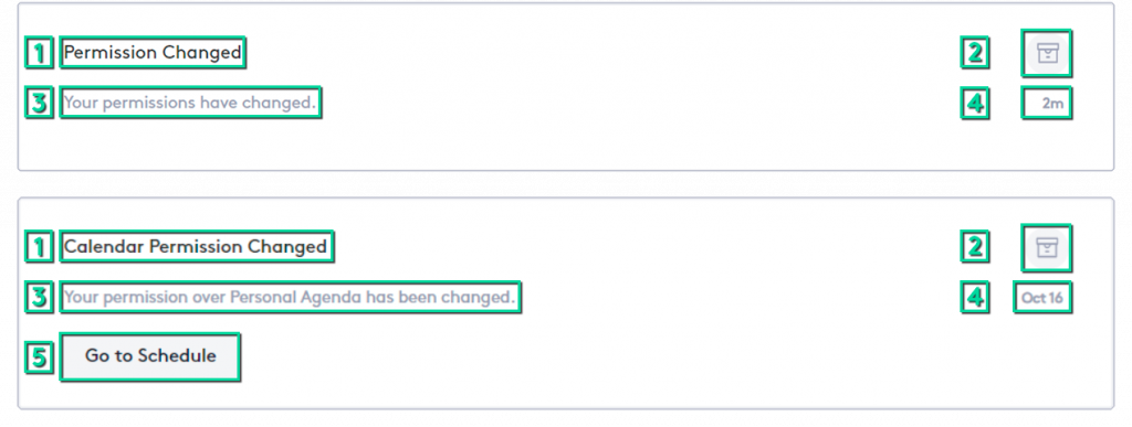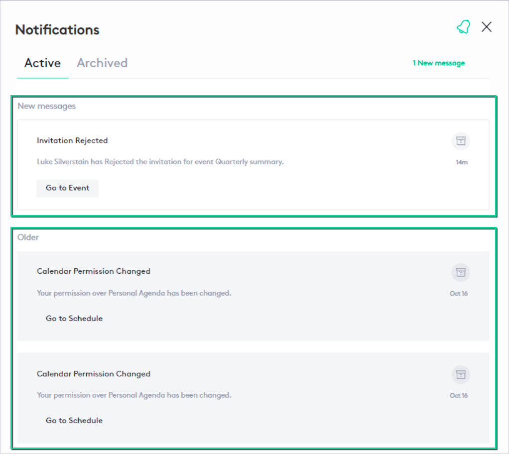- Redirect button: Available only if an action should be taken. Will direct you to the window of the item corresponding to the notification, where you can observe or perform the action reflected in the description.