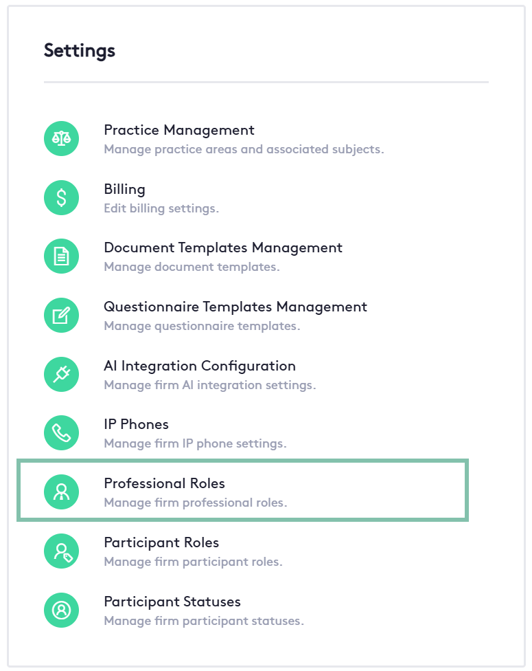 Professional Roles act as labels that categorize your staff based on their function within the firm. Once these roles are created, they can be linked to individual users, making it easier to filter, manage, and assign personnel to specific legal matters