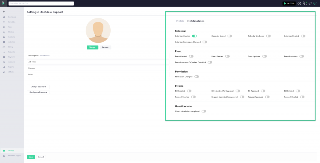 The User Notification Settings page in Maatdesk allows each user to control how and when they receive alerts about key activities across the platform. These settings help ensure you stay informed about updates that matter—without unnecessary noise.