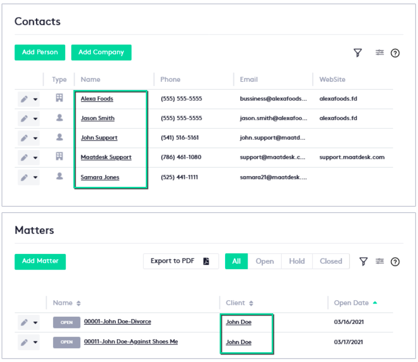 The matter name is a link that redirects to the corresponding Matter dashboard.
