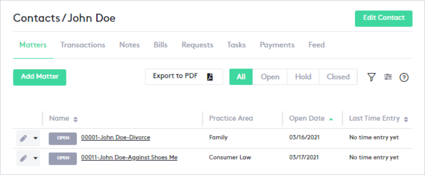 This tab contains all the matters created for the contact and its main information. As in the Matters window, you can perform the following operations: