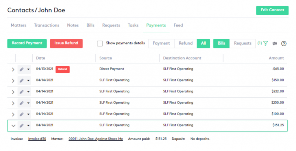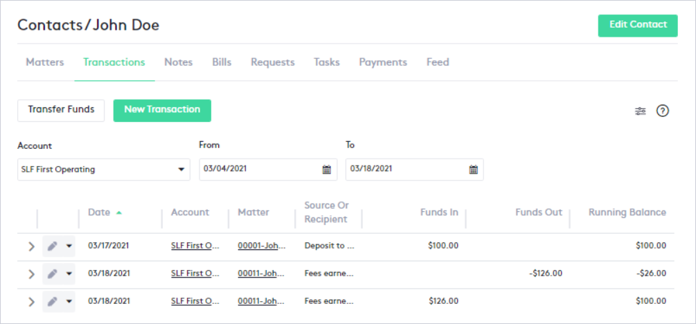 This tab contains all transactions and transfers between matters and bank accounts, always made from or for the contact.