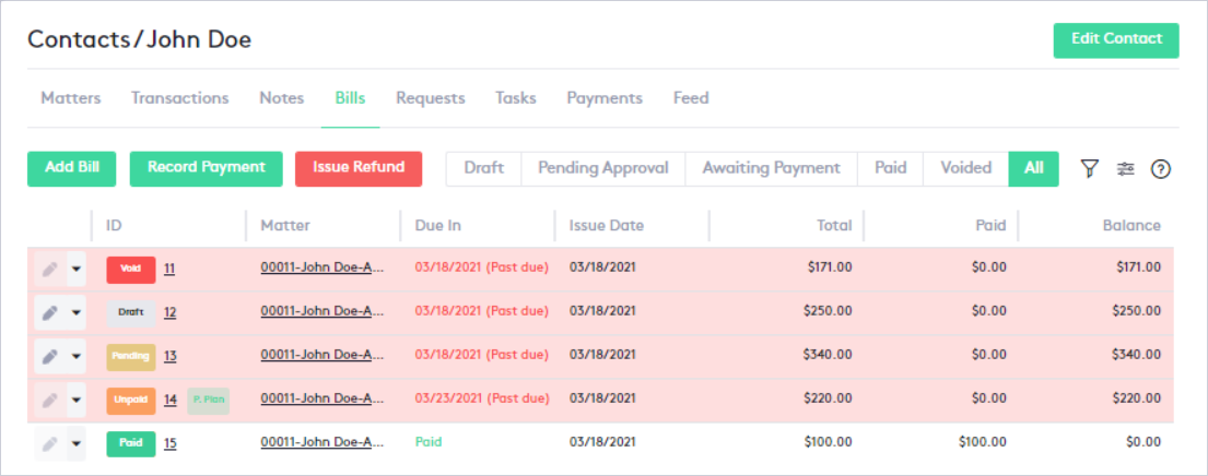 Matter name and bill ID provide links that will redirect you to the corresponding Matter dashboard or Invoice Details window.