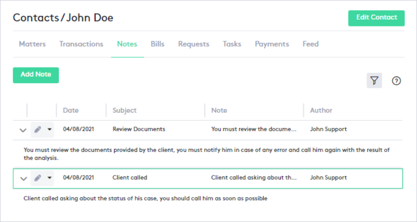 In this tab, you can see all the notes related to the contact, it also allows you to: