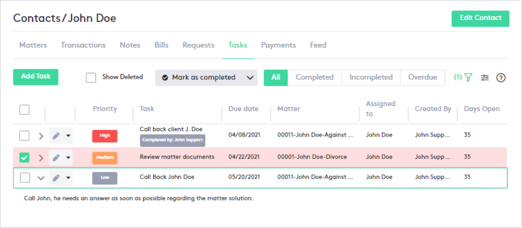 This tab shows only the tasks assigned to the contact. It also allows you to:
