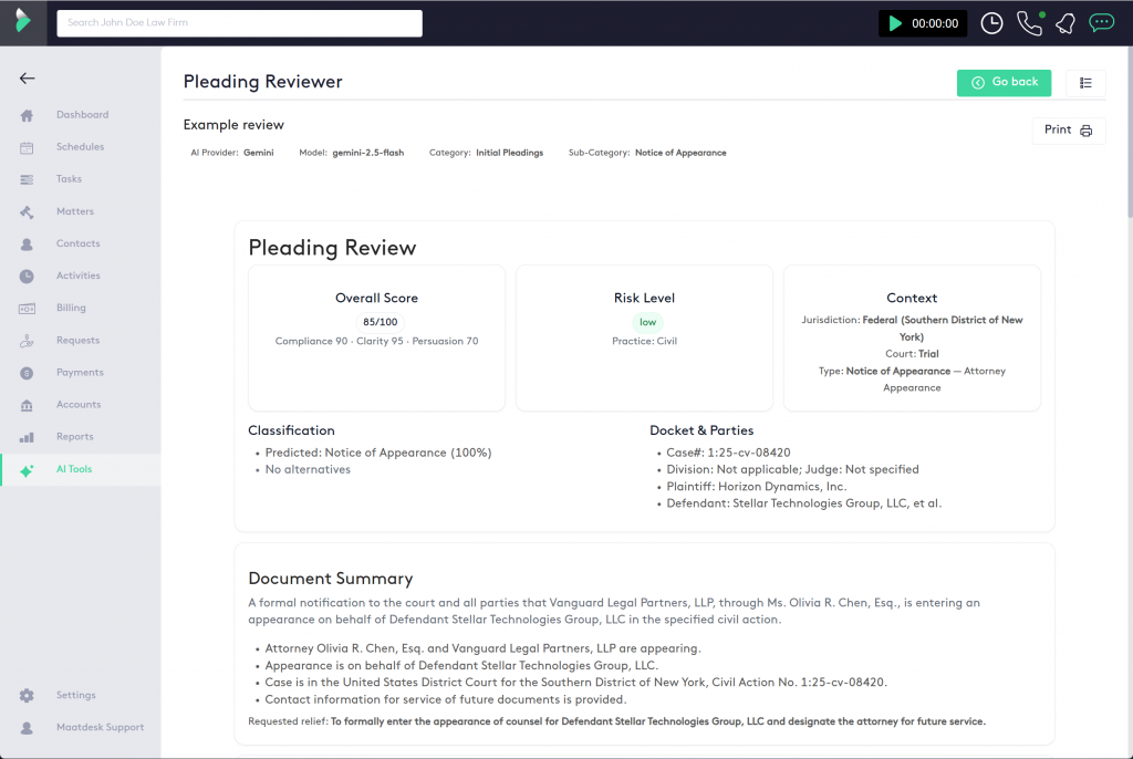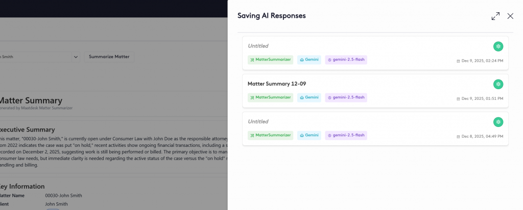 All AI responses generated from all Maatdesk AI Tools are automatically saved, and can be viewed, exported, edited, and deleted.