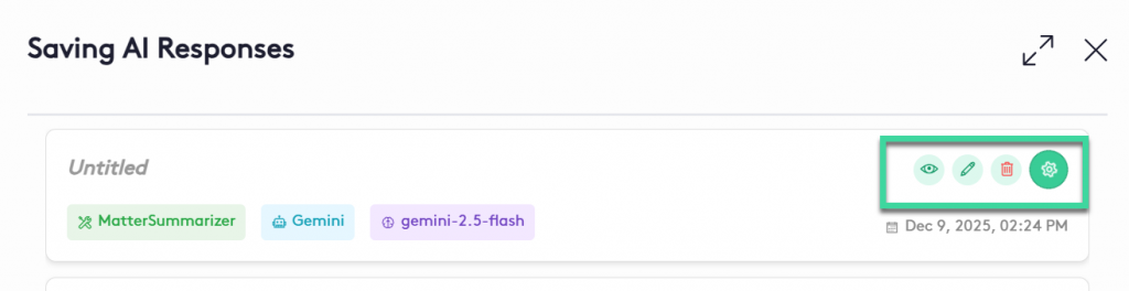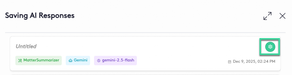 From this pane you can view, edit or delete an AI Response from different AI Tolls by clicking on the green button on the right with a Gear icon