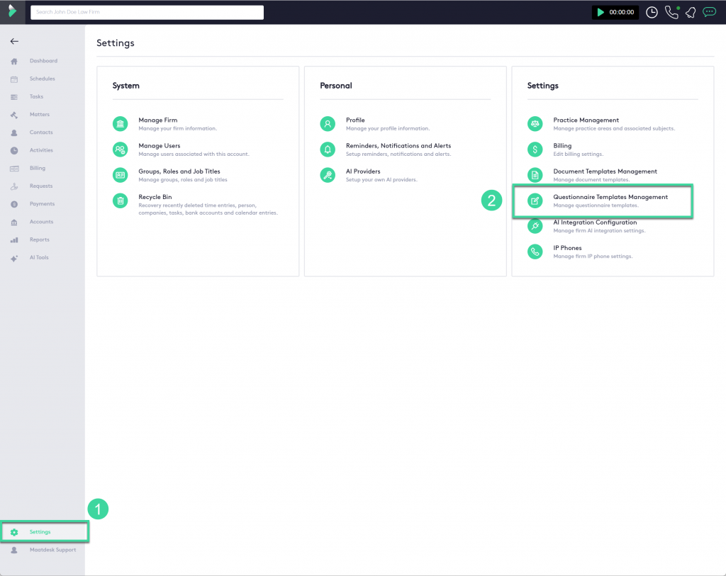 The main Questionnaires Templates management screen is accessible from the Settings main page.