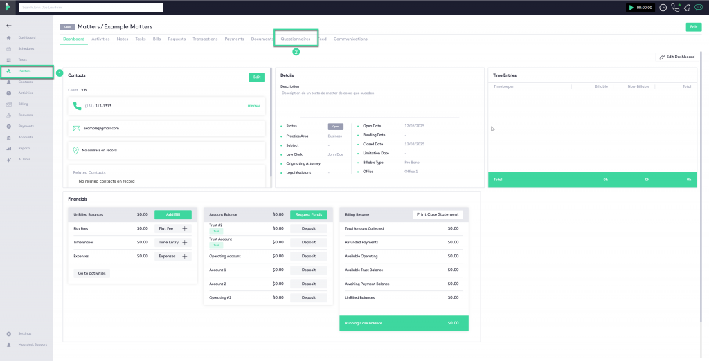 1. Navigate to the specific matter you wish to send the questionnaire for (e.g., Matters/00076-example-matter).