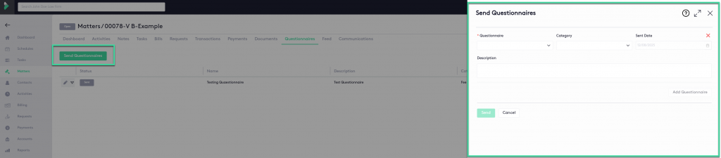 Questionnaires are distributed to clients or contacts directly from the relevant Matter dashboard.